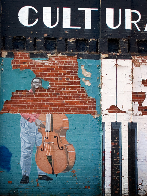 An old decaying mural painted on the side of a building in downtown Fresno, California.